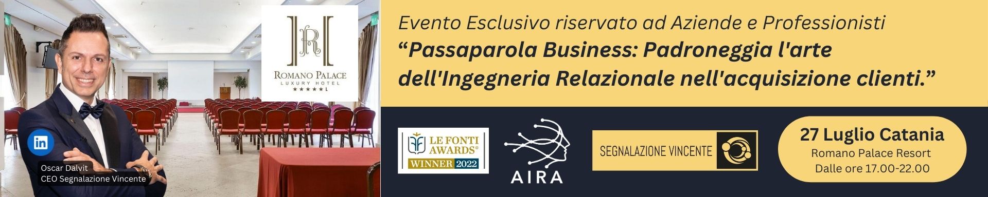 Segnalazione Vincente è orgogliosa di presentare un evento esclusivo presso il Romano Palace Luxury Hotel di Catania, un'oasi di eleganza e comfort. Questa giornata sarà dedicata all'esplorazione dell'Ingegneria Relazionale tramite l'algoritmo AIRA©, un'avanguardia nel mondo dell'acquisizione clienti mirata e di qualità e parte fondamentale del sistema SEGNALAZIONE VINCENTE.
